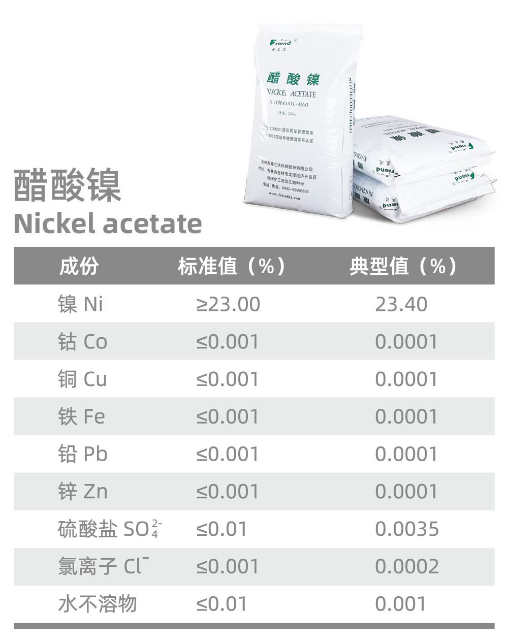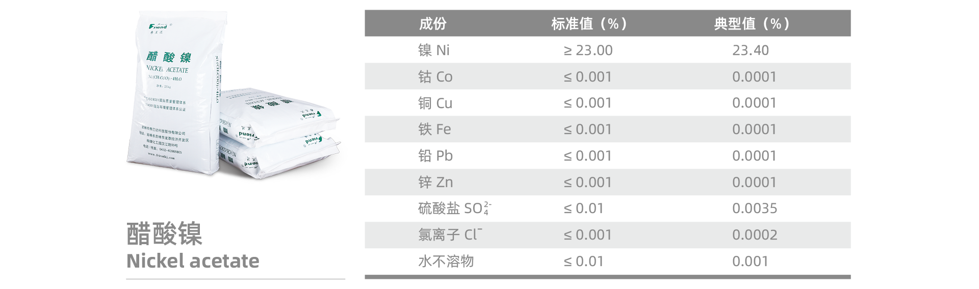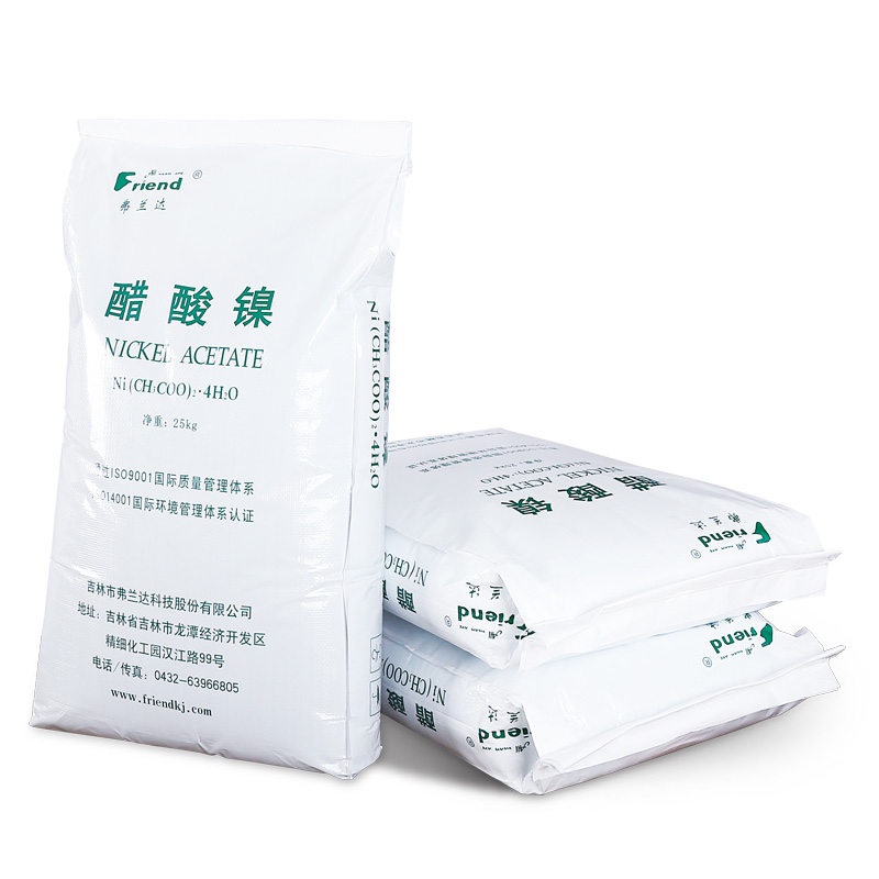 醋酸鎳(Nickel acetate) 分子式:C4H6O4Ni·4H2O 分子量:248.86 性 狀:綠色結晶性粉末,有醋酸氣味,遇水可溶解。 用 途:主要用于封孔劑、表面處理劑、電鍍、陽極氧化、金屬着色、催化劑和陶瓷色釉以及分析化學試劑等。 包 裝:塑編袋裝,每袋25公斤。 儲 運:運輸過程中,防止雨淋、受熱、受潮。不宜與酸類物品混運。貯存在通風、陰涼、幹燥的庫房内,防止雨淋、受潮。不宜與酸類物品混貯。